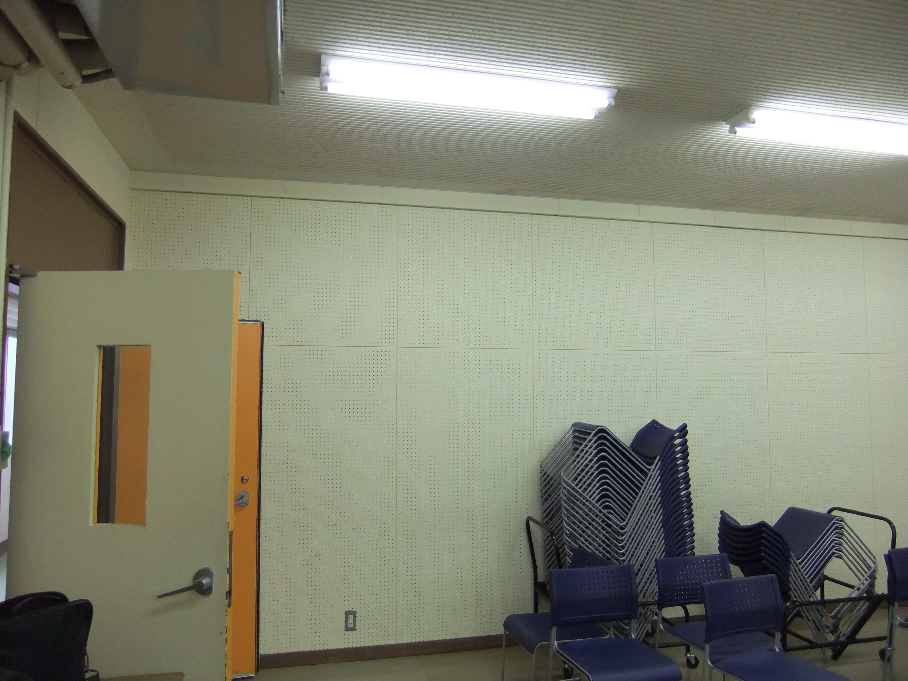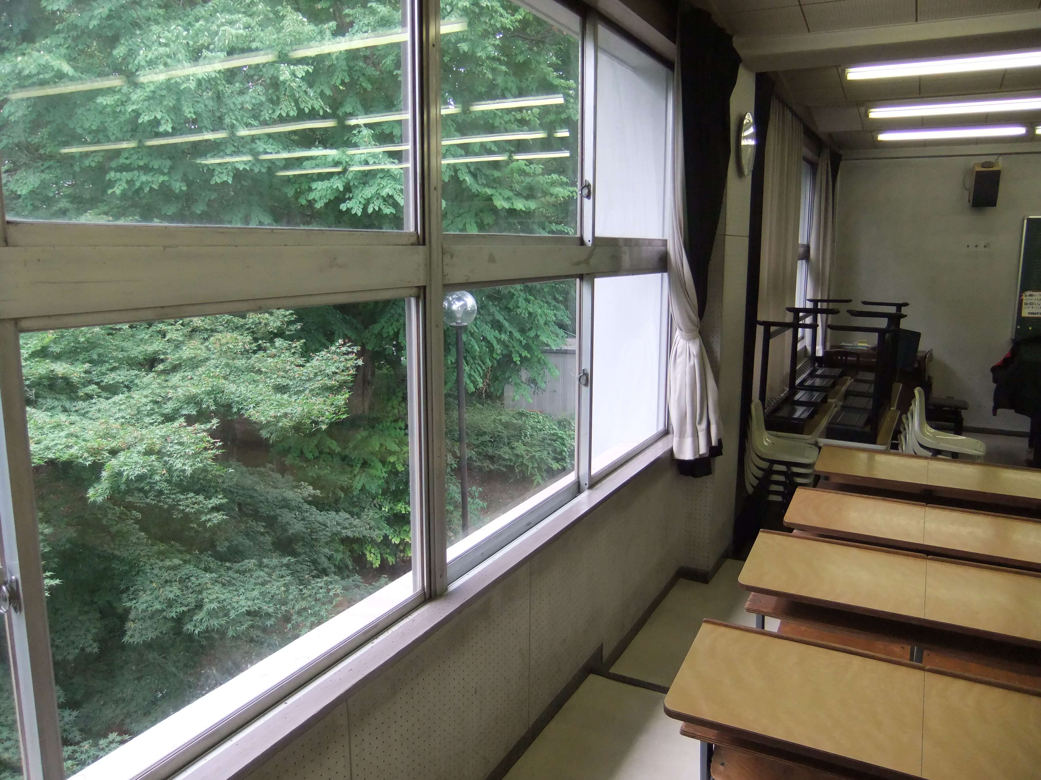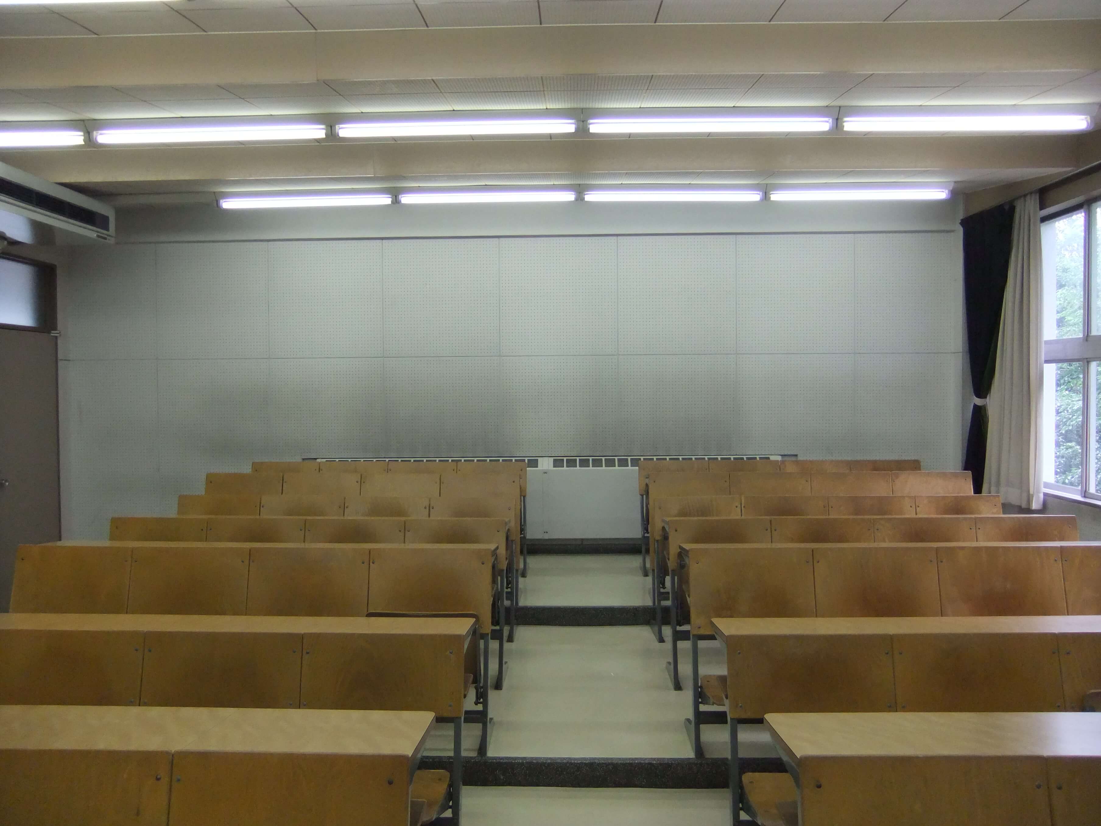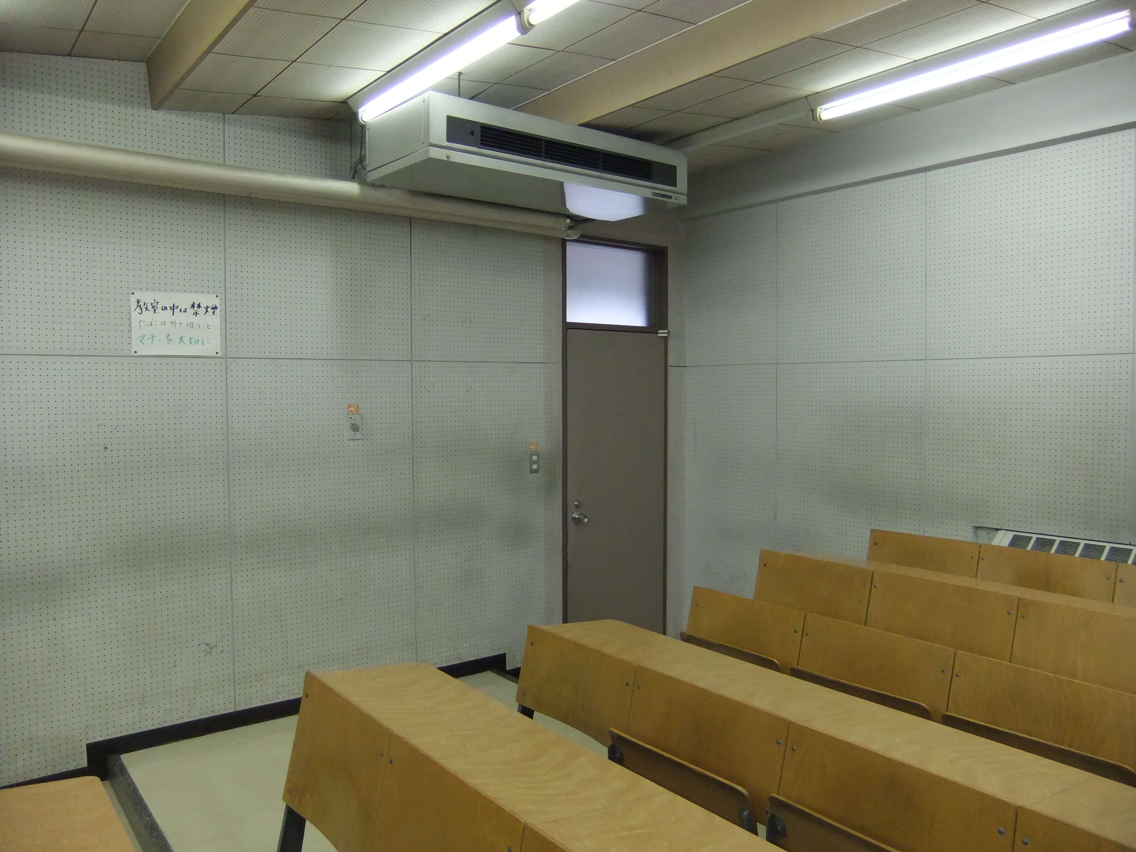 511教室の後方出入口。自分が学生だった頃は、パイプ椅子を使っていました。