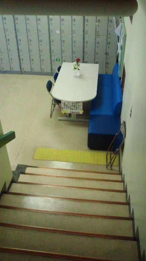 階段を下りてきたところ。昔ながらのダイヤル式ロッカーです。
