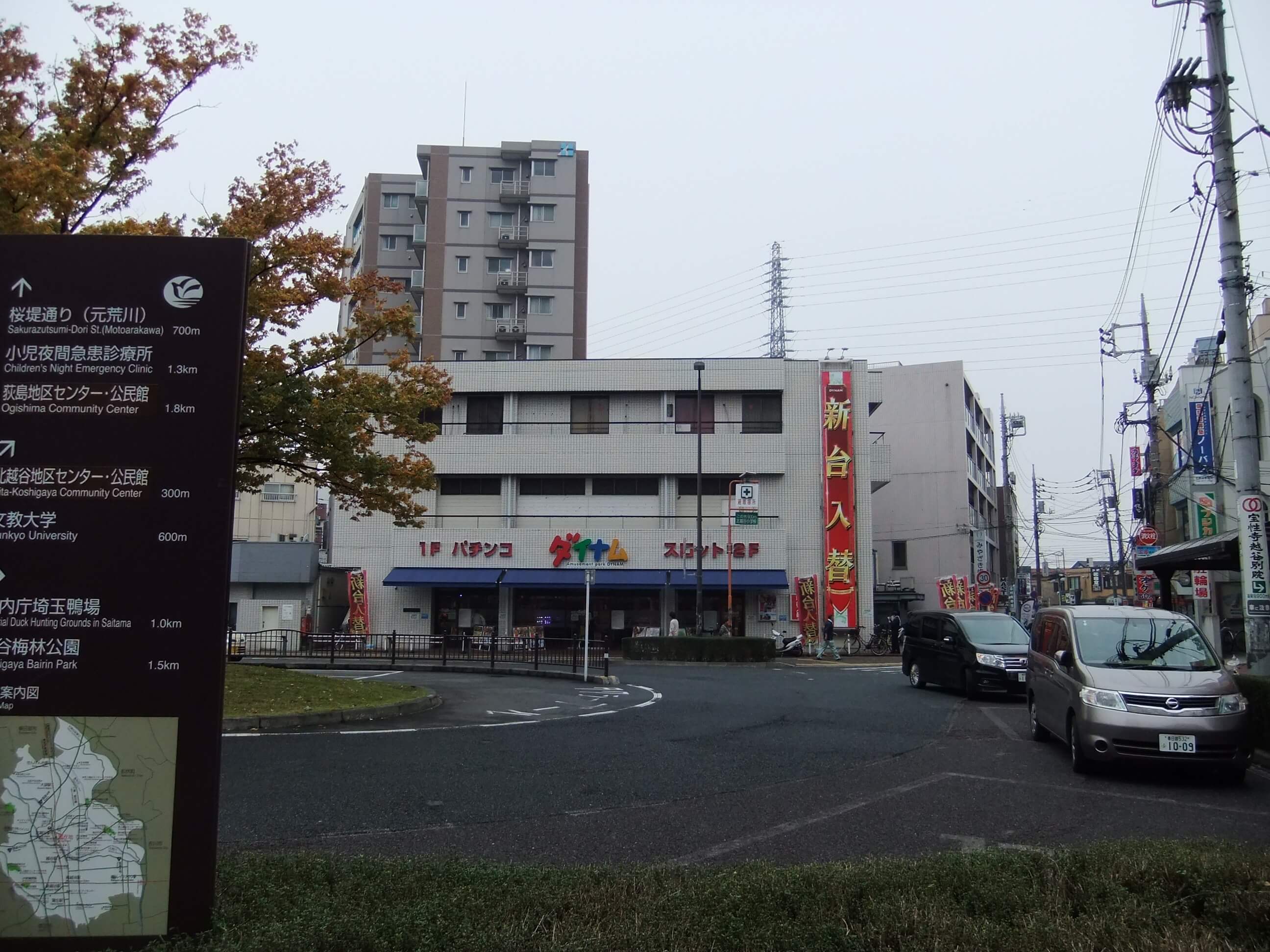 北越谷駅西口にて。駅前にはずっと変わらずパチンコ・スロットの店が。
