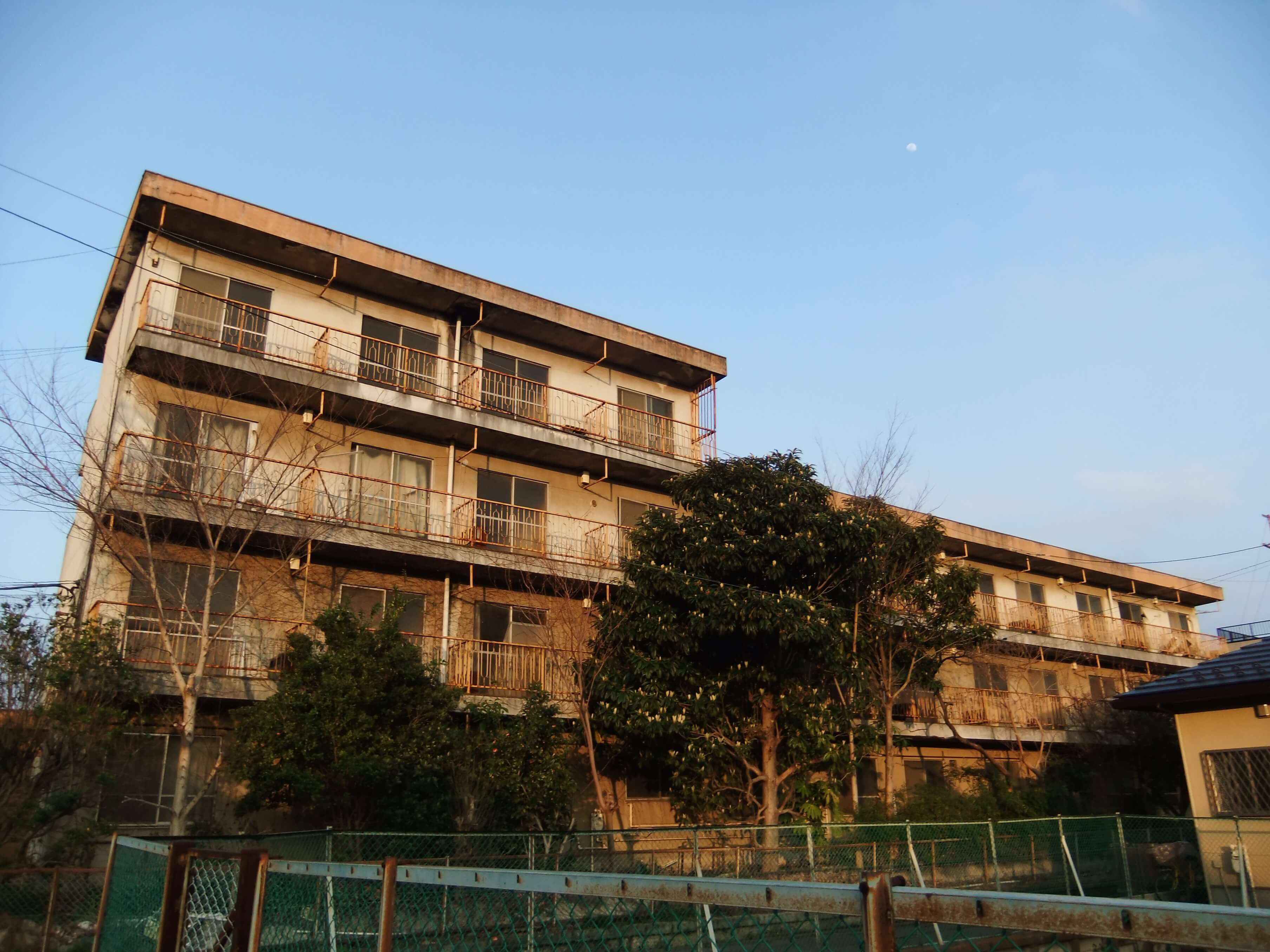 夕日を浴びて建つのは、かつて大学の指定寮であった「石井コーポ」です。