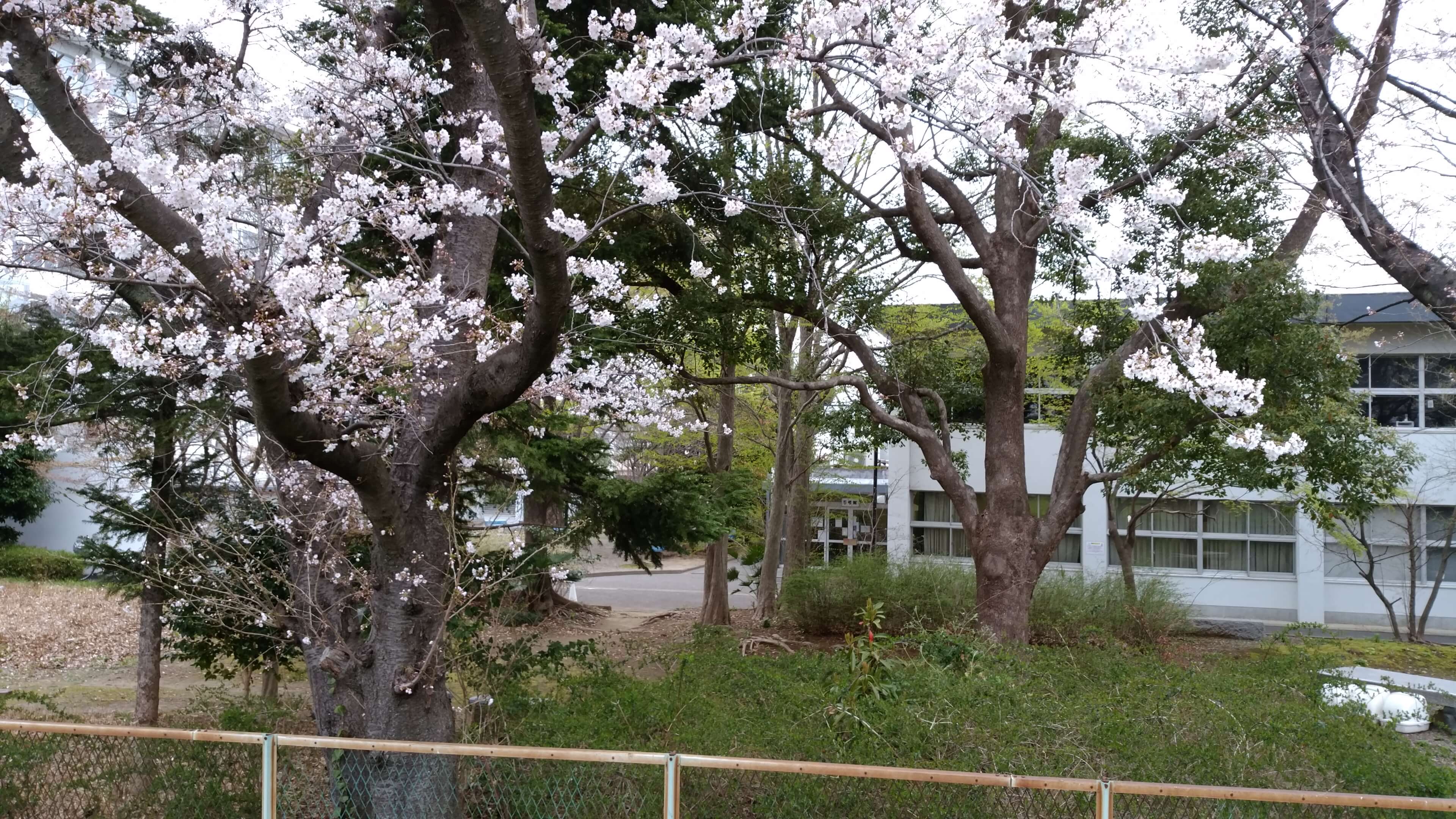 掲示板と、ええと、花の見分けがつかないのですが、あれは梅でしょうか?それとも早咲きの桜?