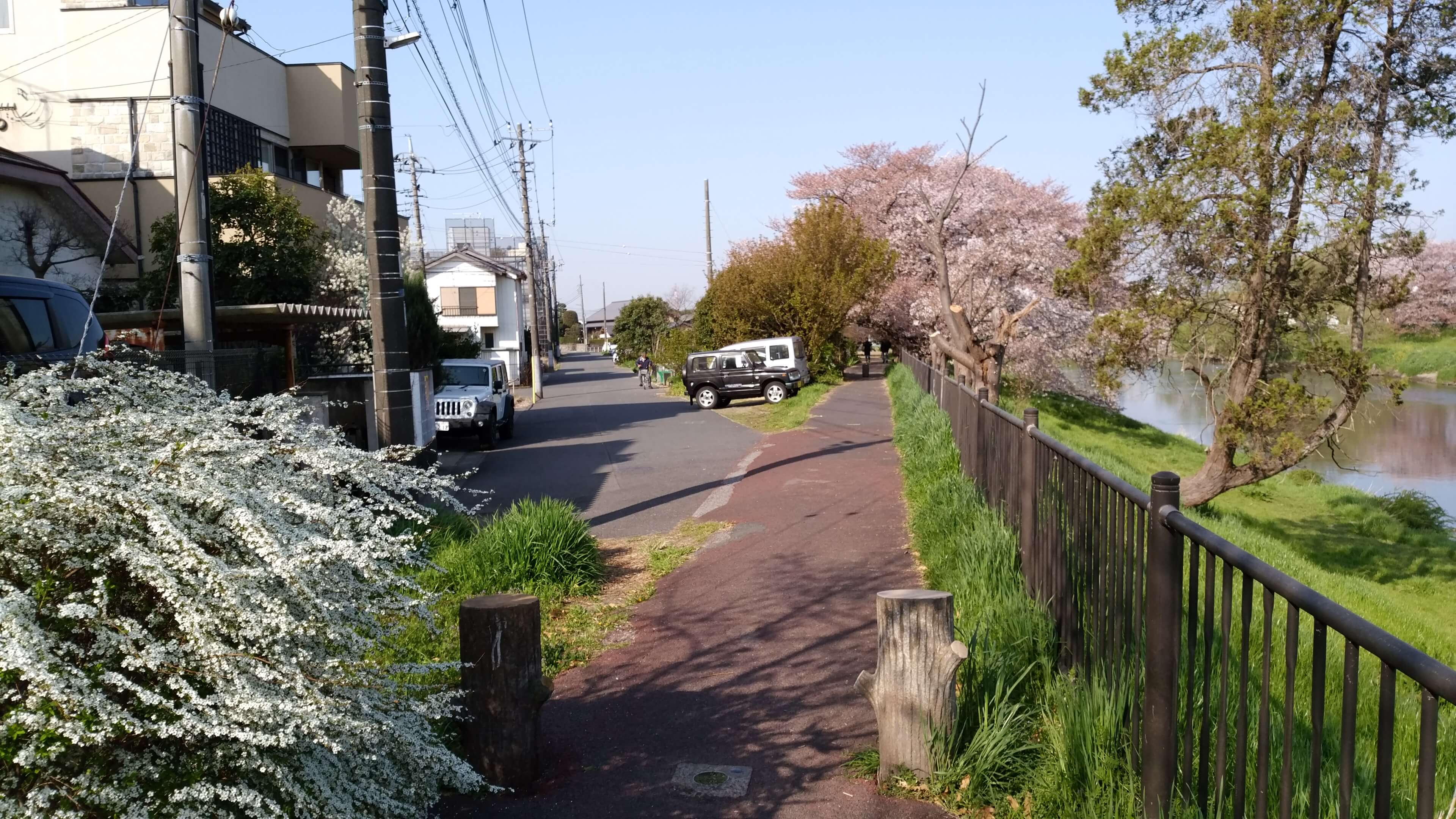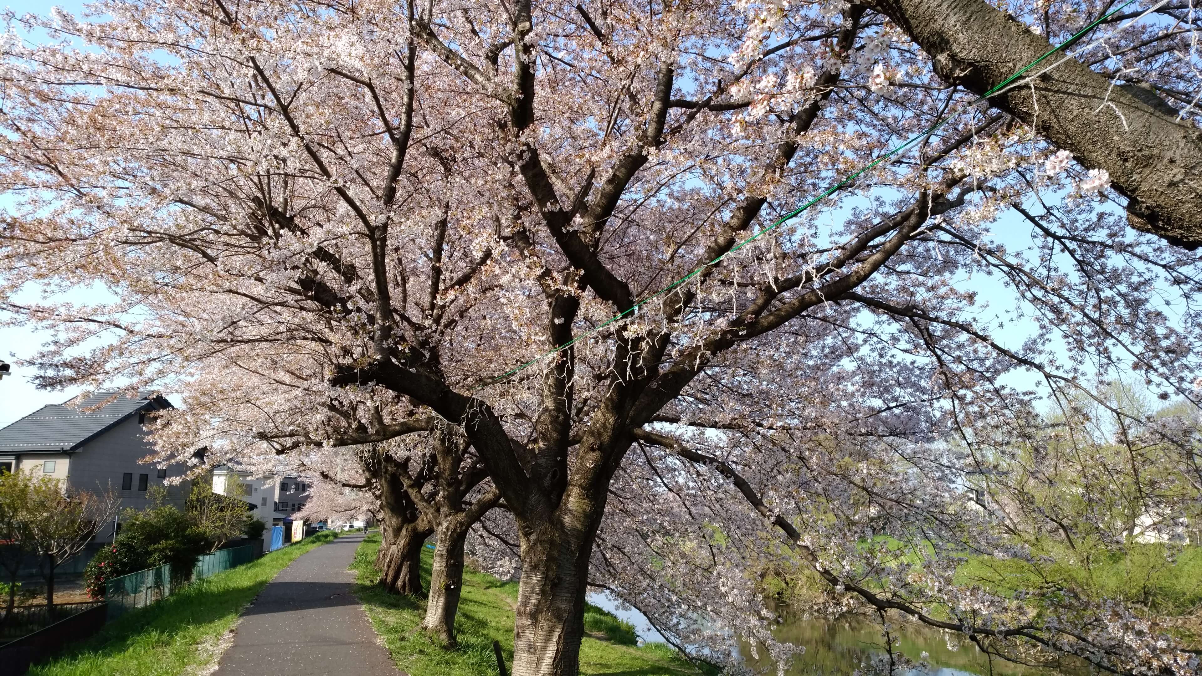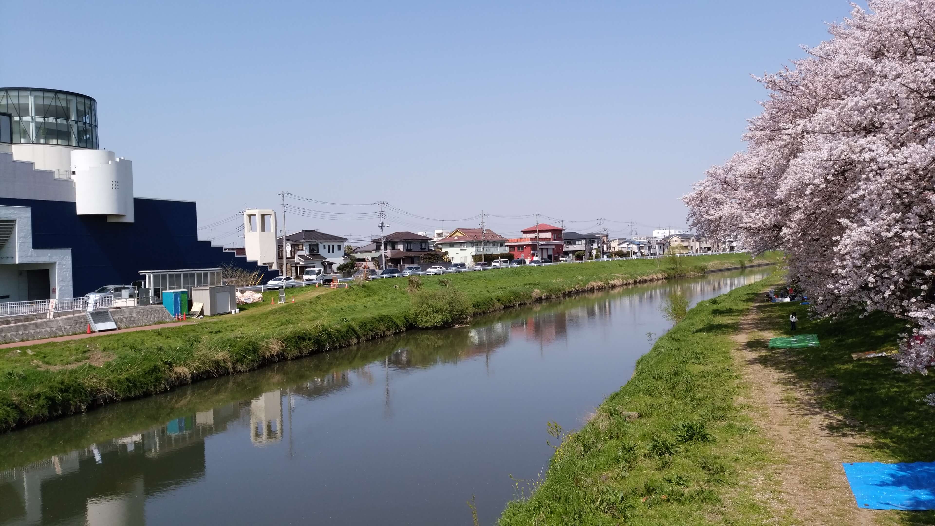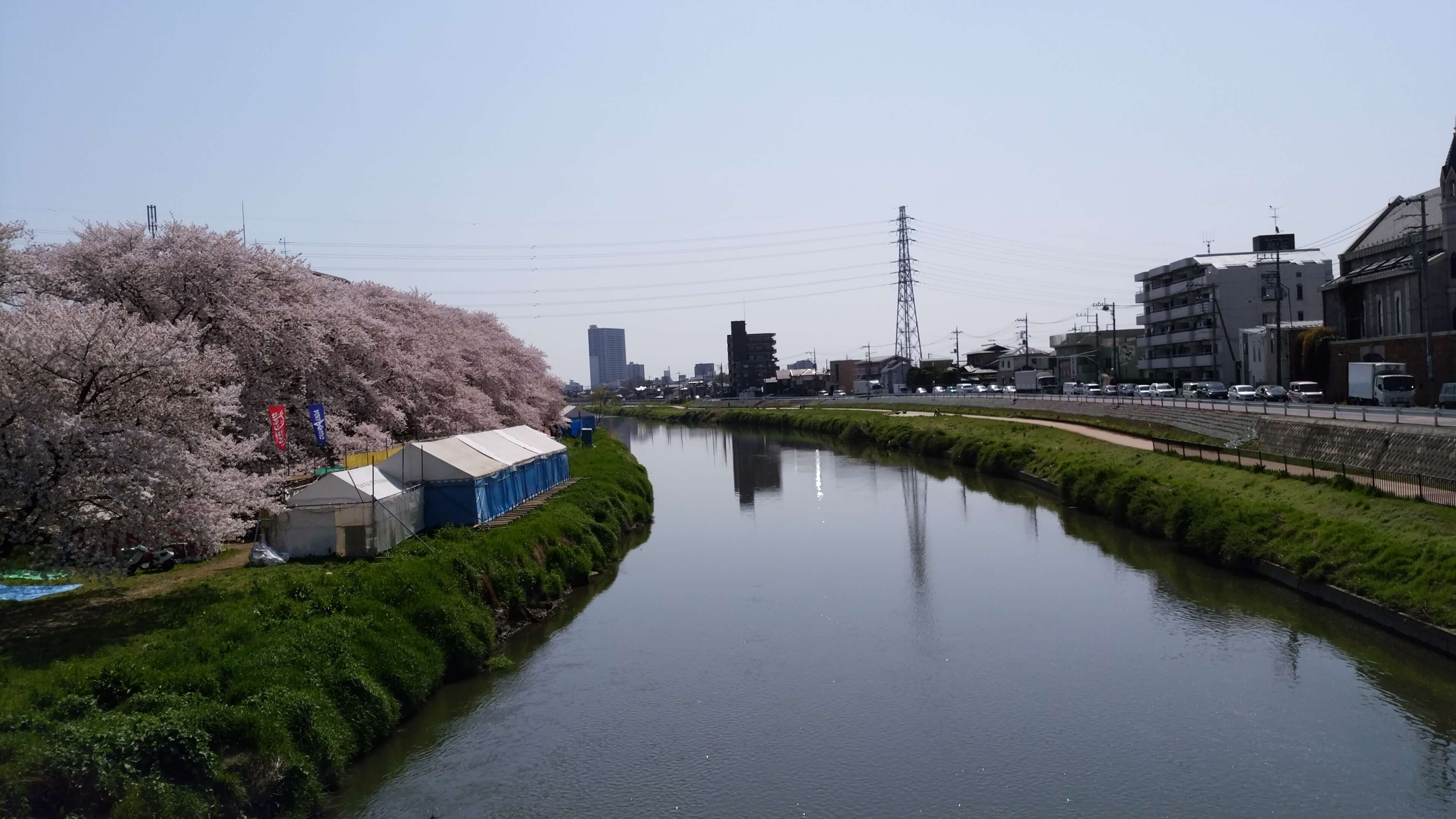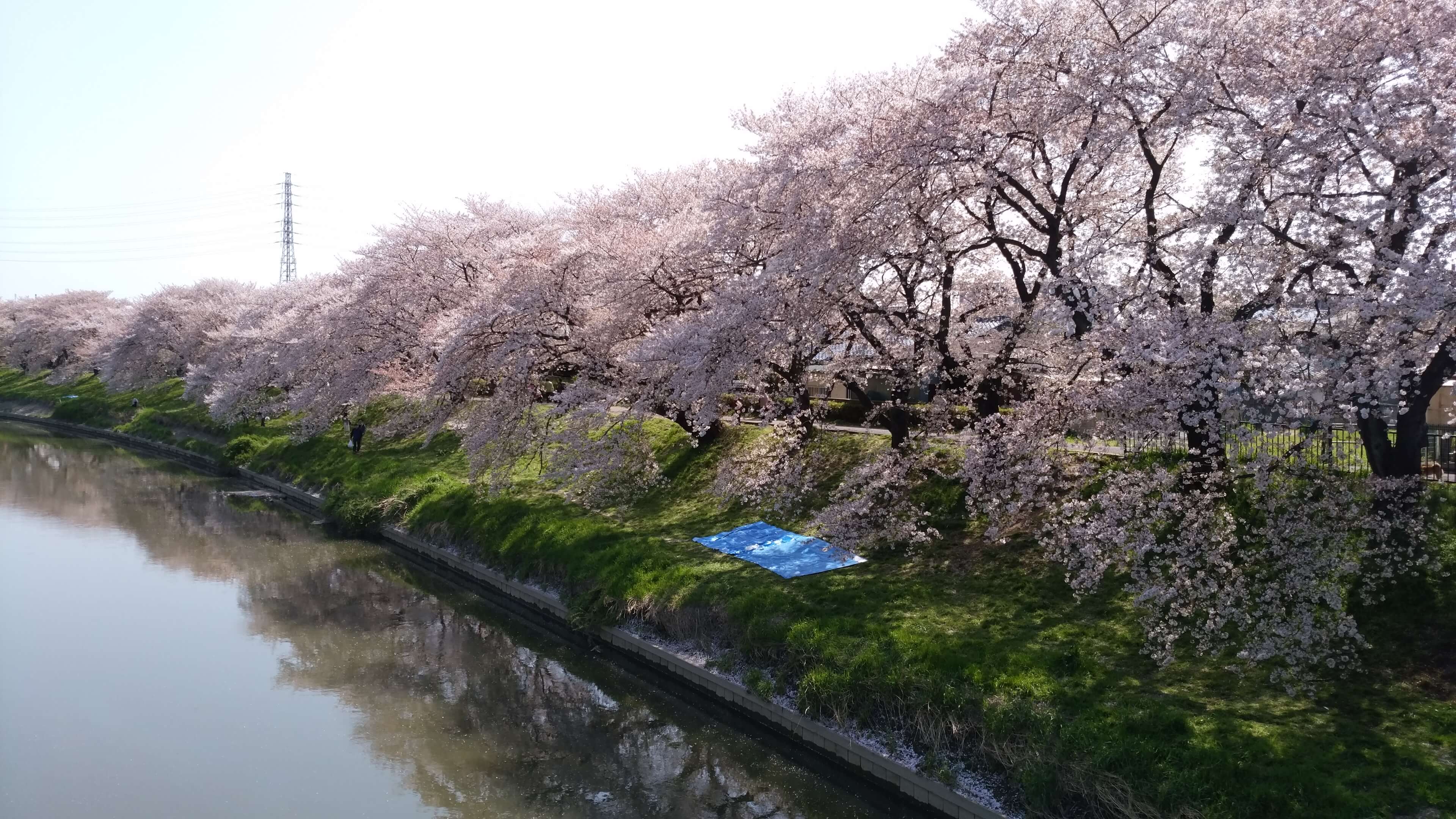 こちらの川沿いにも、お花見をする人の姿が見られました。場所取りかな?