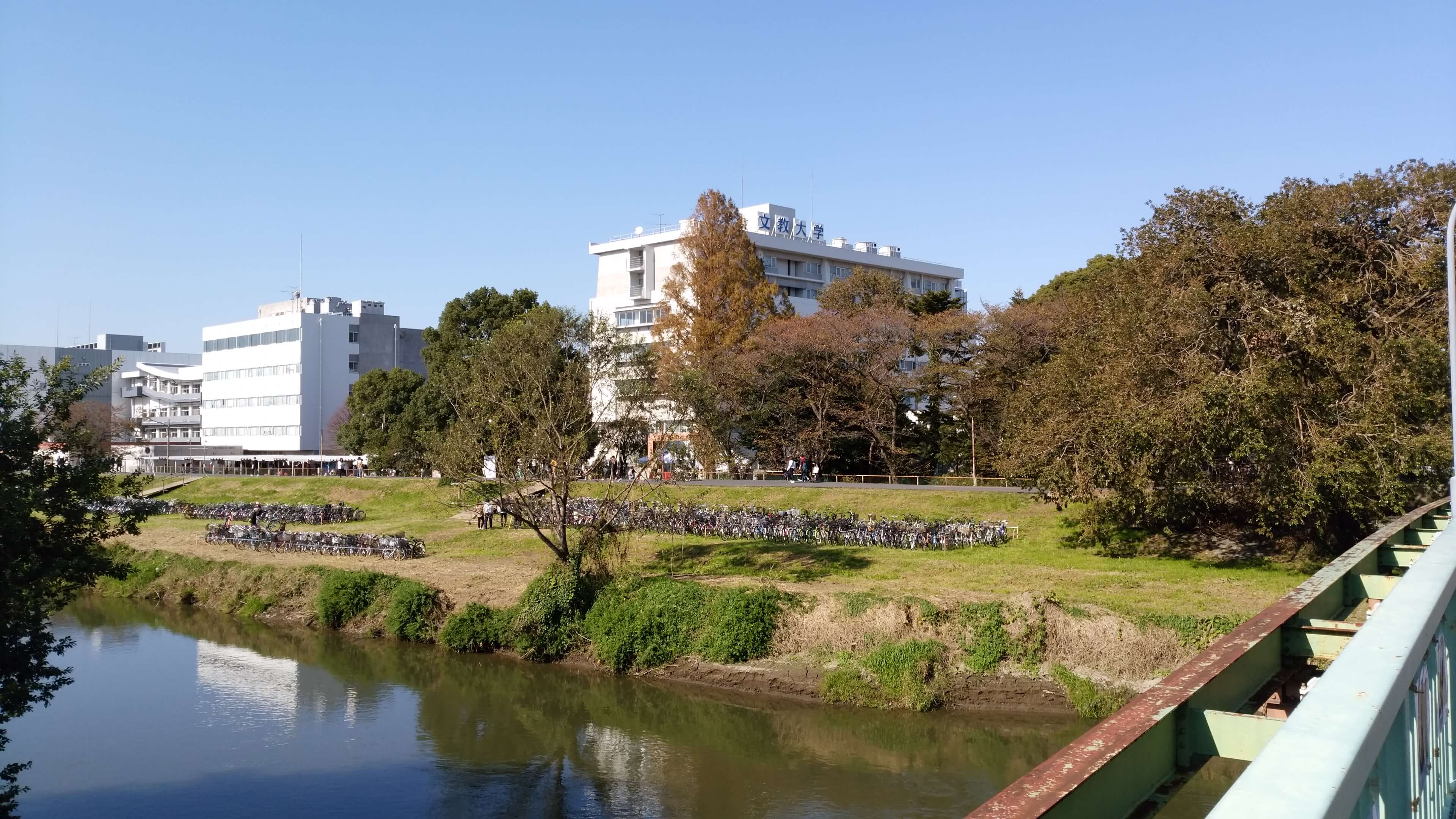 11月、大学の学園祭にやって来ました。土手や川岸の草が、きれいに刈り取られています。