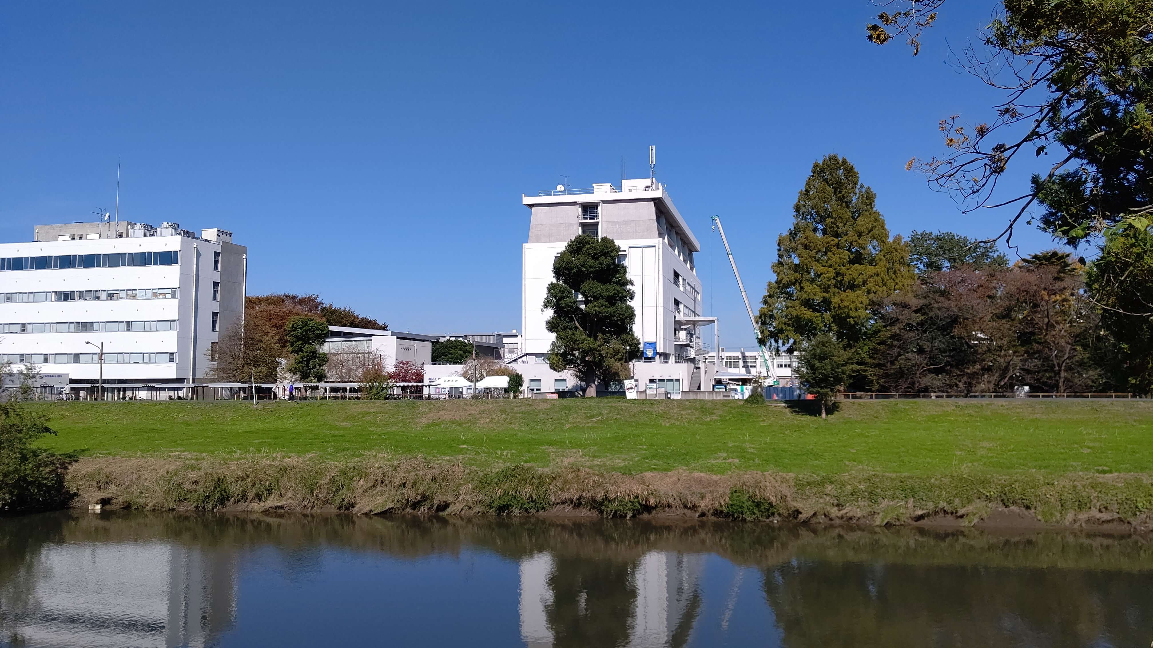 対岸から見た母校。建設途中の新校舎は、木の陰に隠れています。