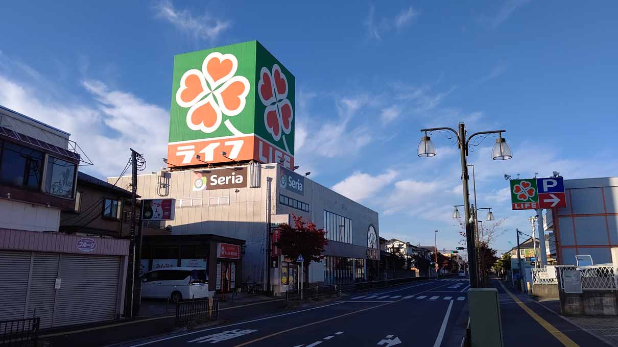 年寄りの朝は早い(笑)。朝日を浴びる「ライフ」の看板。