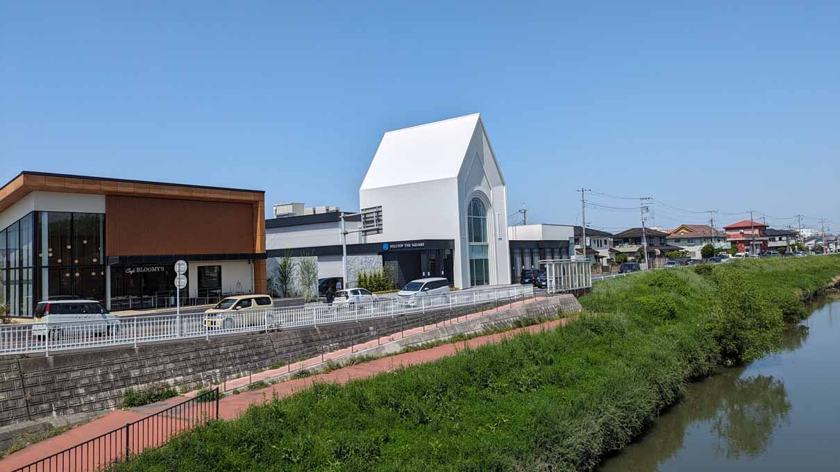 神明橋の上から。新しくなったギャザホールの様子。
